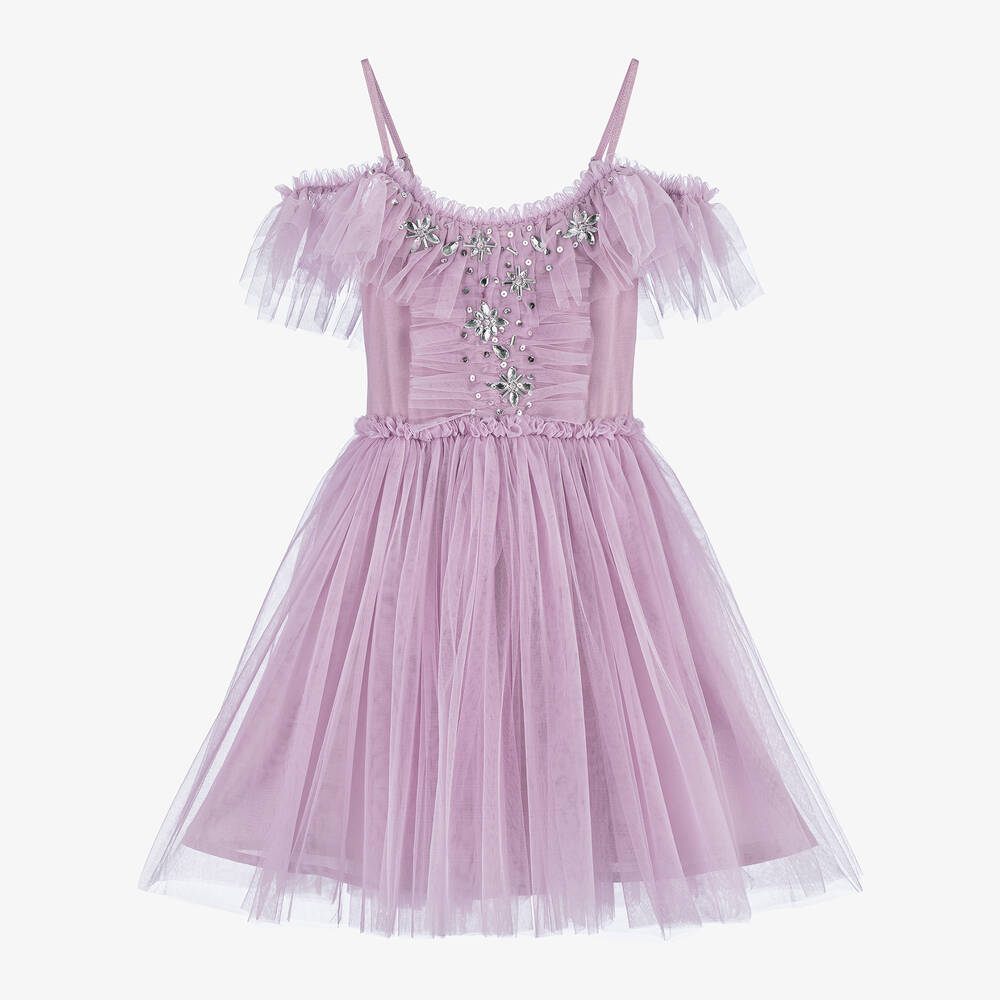 In a lovely lilac-purple shade, this pretty special occasion dress for girls is from Australian brand, Tutu du Monde. It is beautifully hand-crafted in an off-the-shoulder style, with adjustable, stretchy shoulder straps for comfort. The bodice has a tulle overlay on the front, with delightful ruffle trims, sparkly rhinestones and shiny sequins. Lined with cotton for comfort, the skirt is formed by layers of ruffled tulle to complete the charming silhouette. Items are made to last and become more lovely with wear as slight fading and fraying edges add to their charm.