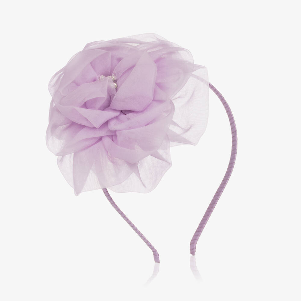 A lilac purple hairband for girls by Tutu du Monde. The narrow flexible band is covered with silky fabric for comfort. Off-centre is an oversized organza flower with sparkly beads in the centre for an elegant finish.