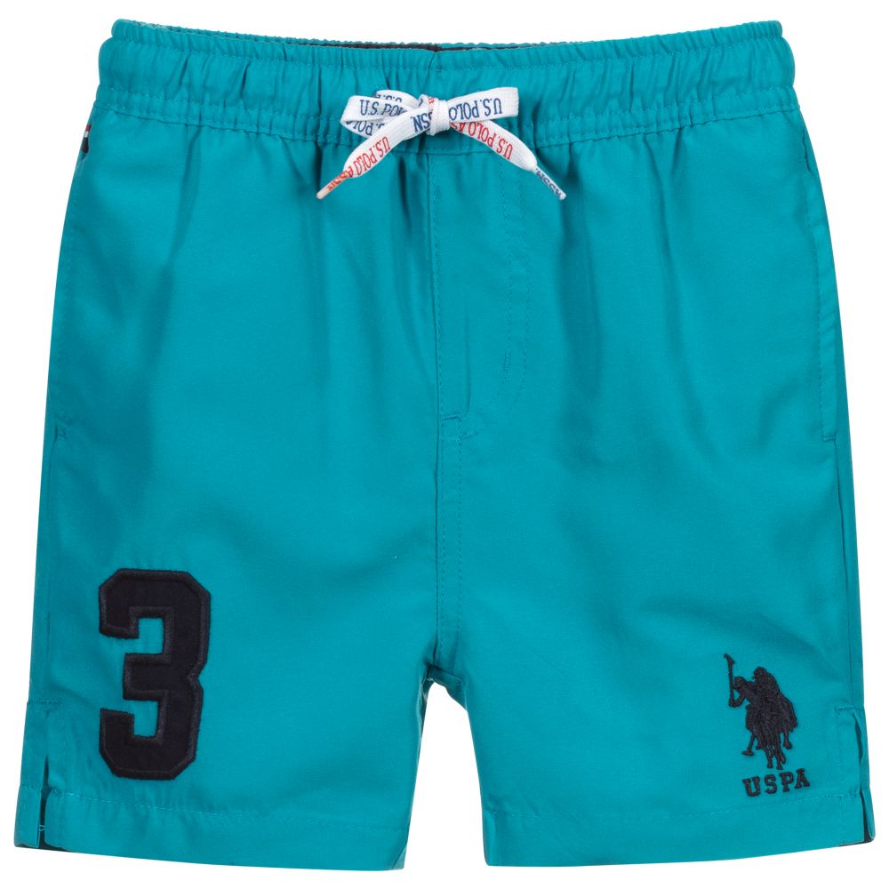Boys turquoise blue swim shorts from U.S. Polo Assn., with navy blue logo embroidery and number '3' appliqué on the front. Made in soft polyester, they have a comfortable mesh lining and a drawstring waistband. There are useful side pockets and a velcro-closing pocket on the back.