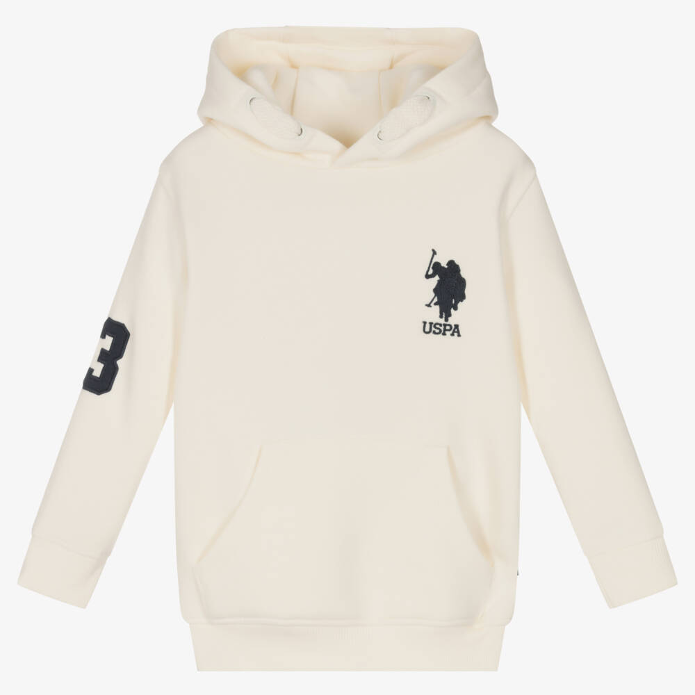 Ivory hooded sweatshirt for boys by U.S. Polo Assn., made in soft mid-weight jersey with a cosy fleece underside. It is embroidered with the brand's navy blue double horseman logo on the chest and has the classic number 3 on one sleeve. To complete the look, there is a pouch pocket on the front and a faux drawstring detail on the hood.