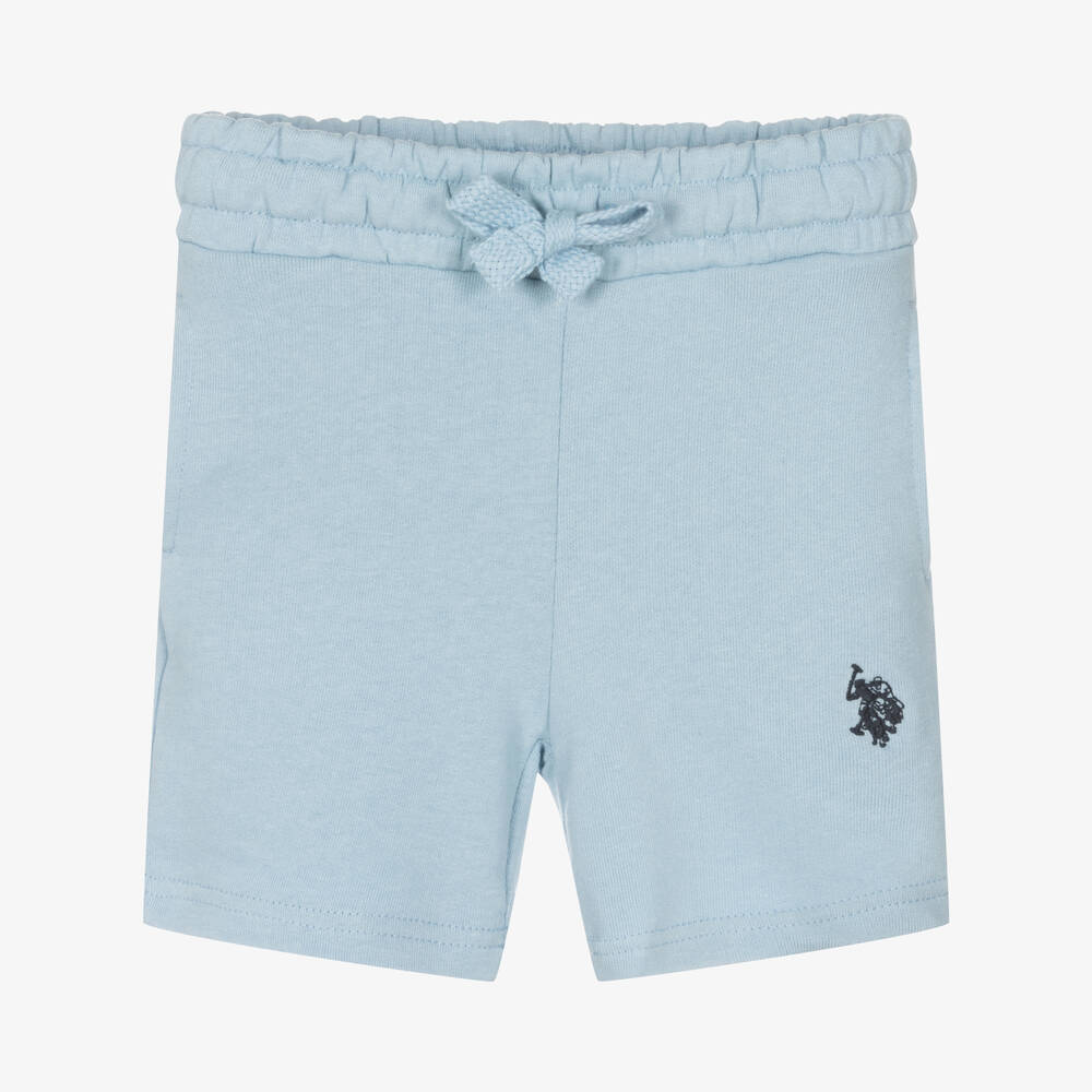 Light blue shorts for boys by U.S. Polo Assn., made in soft and stretchy, mid-weight cotton jersey. They have the brand's double horseman logo embroidered on one leg in navy blue. These casual shorts have side seam and back pockets and a useful drawstring waist to ensure a comfortable fit.