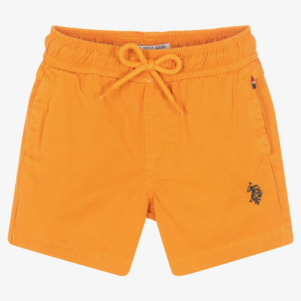 Orange shorts for boys by U.S. Polo Assn., made in soft cotton twill. They have an elasticated waistband with a drawstring fastening for a comfortable fit and there are useful pockets on the front and back. The brand's double horseman logo is embroidered in navy blue near the hem.