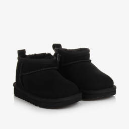 Black suede leather ankle boots for boys and girls by UGG, made in the brand's luxuriously soft and warm twinface sheepskin. The soft wool blend faux sheepskin insole provides extra cosiness and the lightweight yet durable rubber outsole is moulded for better grip. They have a tonal logo heel patch and a side zip fastening to help with pulling on and off.