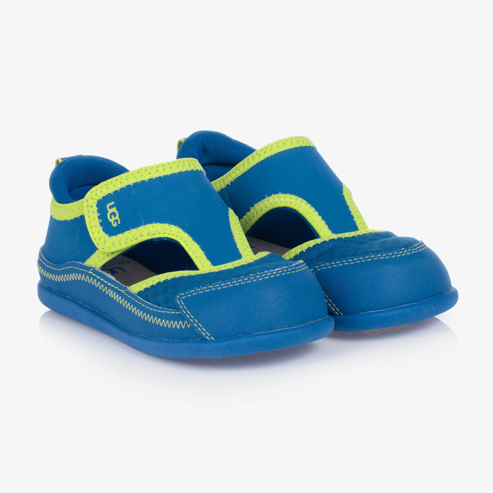 Bright blue sandals for younger boys by Australian brand UGG, with breathable mesh uppers and leather trims. With contrast green details, these versatile, closed-toe sandals have an adjustable velcro strap on the ankle for a secure fit. Other features include a branded heel tab, decorative stitching and a small logo print on the strap. As well as a soft textile lining, these comfortable and flexible shoes have a beautifully soft, gently padded foam footbed and a moulded rubber outsole for good grip.