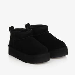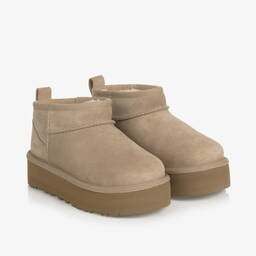 Chestnut brown suede leather ankle boots for boys and girls by UGG. A signature of the brand, they are fully lined in a luxuriously soft wool blend all the way to the toes for extra warmth and cosiness. They feature a logo tab on the back and a chunky platform rubber sole for a stylishly laid-back look. They simply slip-on with a useful leather pull tab to assist on the back.