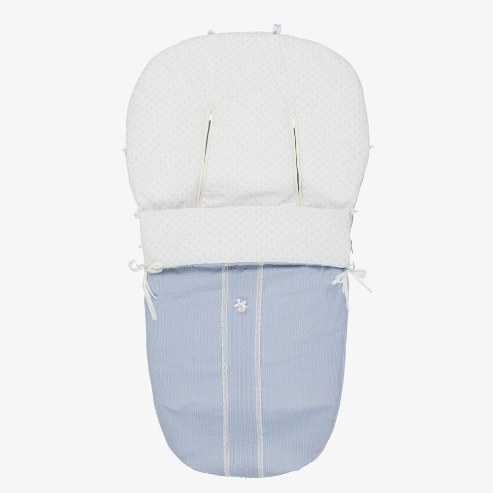 Beautiful blue and white padded footmuff from Spanish brand Uzturre, with pintucks, lace trim and a logo charm on the front. Handmade in soft organic cotton twill, the blue outer has a white polka dot pattern and the white inside has contrast blue stars. The front unzips on both sides for easy access and folds back, secured with toggles and satin bows. The back hooks over the stroller and has adjustable velcro openings and straps.