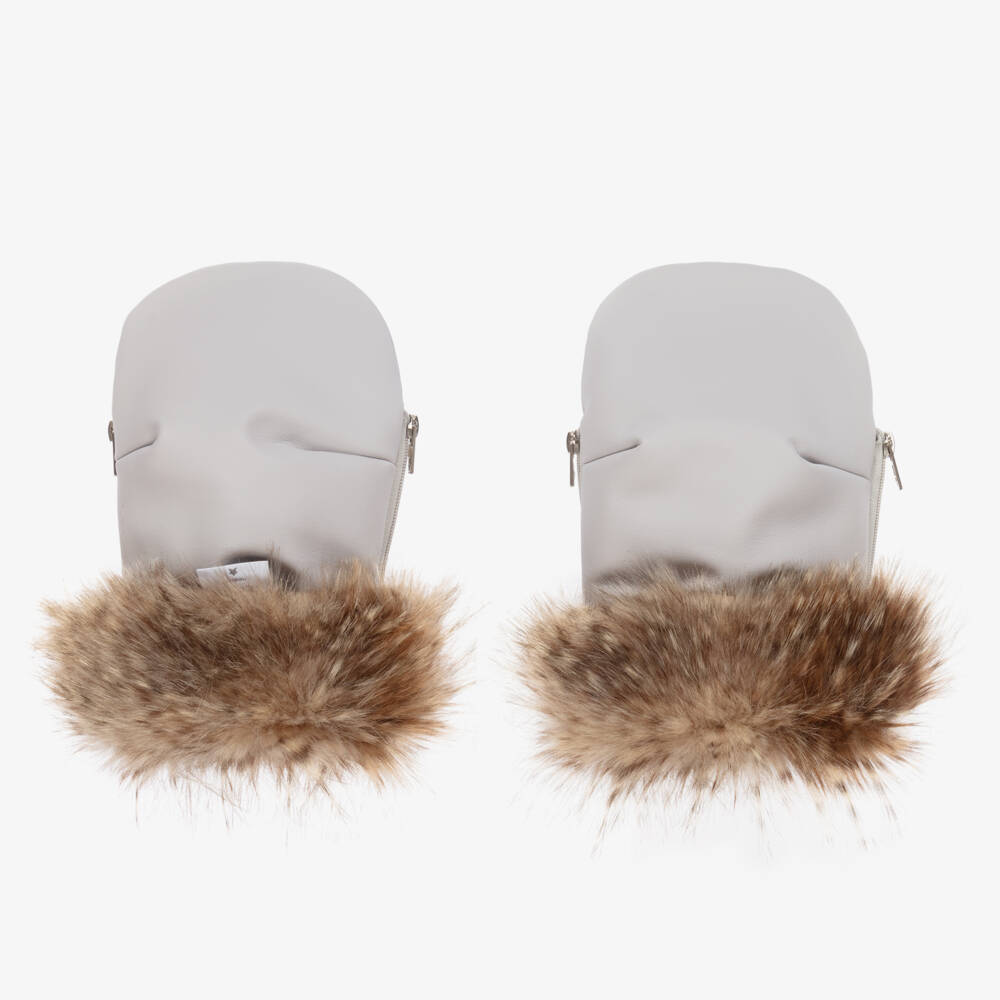 Pale grey stroller mittens by Uzturre, handmade with smooth faux leather. Ideal to keep parents' hands warm, these water-repellent mittens have a super soft plush fleece lining, lightweight padding and luxurious faux fur trims to protect against the wind and cold weather. Cosy and breathable, there are side zips to attach to the buggy handle.
