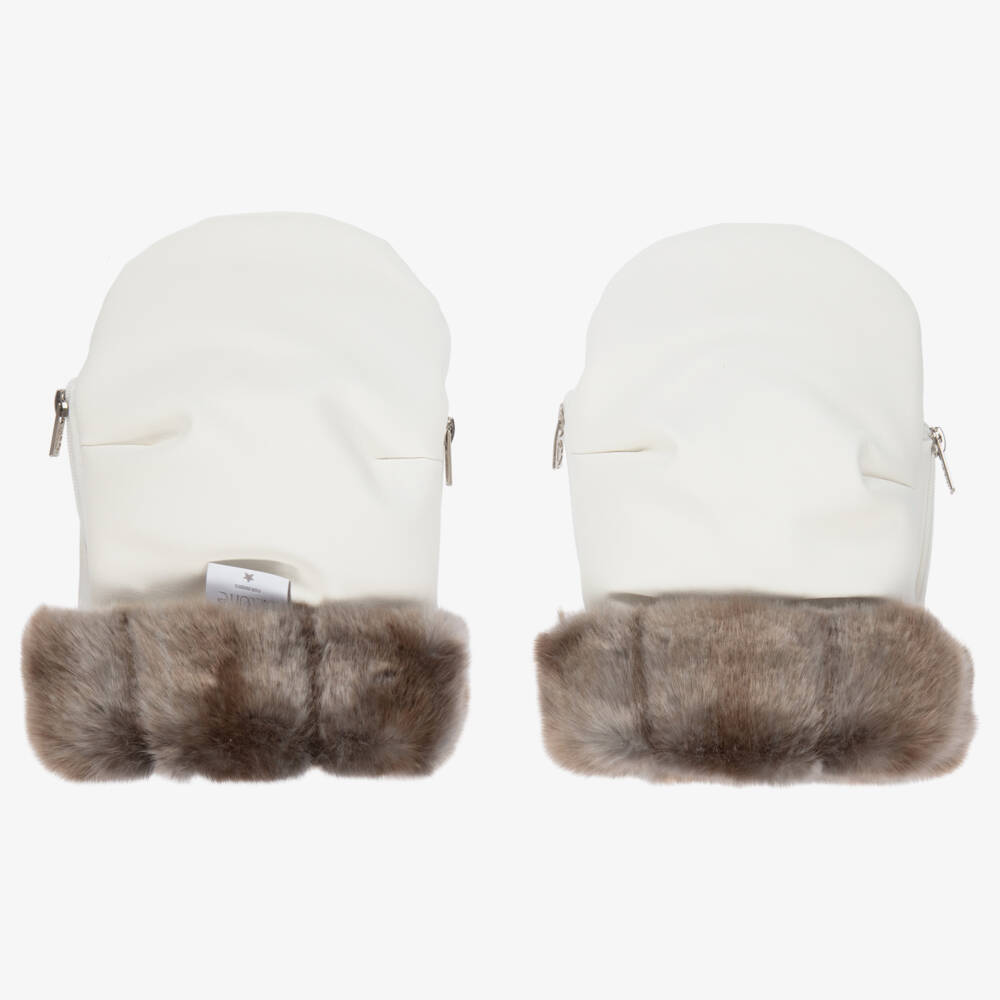 Pale ivory stroller mittens by Uzturre, handmade with smooth faux leather. Ideal to keep parents' hands warm, these water-repellent mittens have a super soft plush fleece lining, lightweight padding and faux fur trims to protect against the wind and cold weather. Cosy and breathable, there are side zips to ensure a great fit.