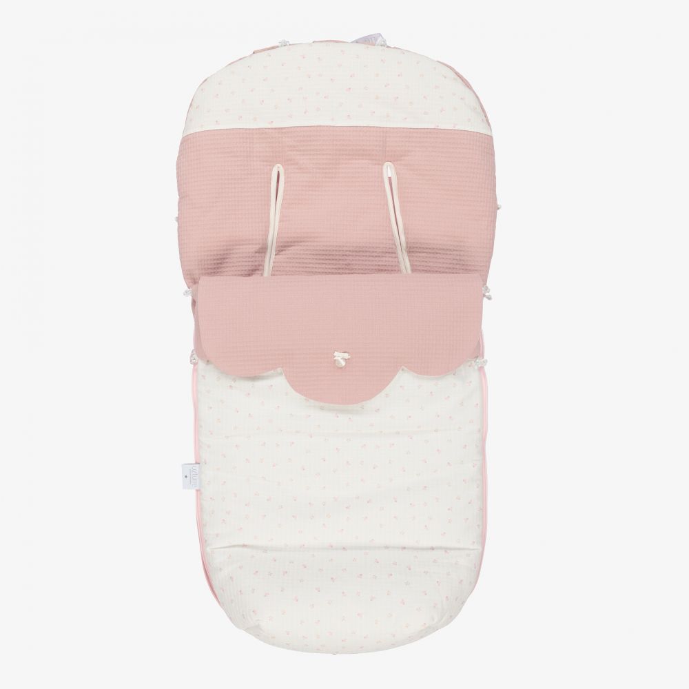 Baby girls pretty pink and ivory padded footmuff by Spanish brand Uzturre. Handmade in organic cotton, the front has a pretty pink floral print with a weave textured pink lining and a detachable and reversible scalloped flap detail. There are zips on both sides for easy access, secured with toggles. Hooks over the top of the stroller, it has cut-out openings for stroller straps with velcro and elastic straps on the back to keep it in place.