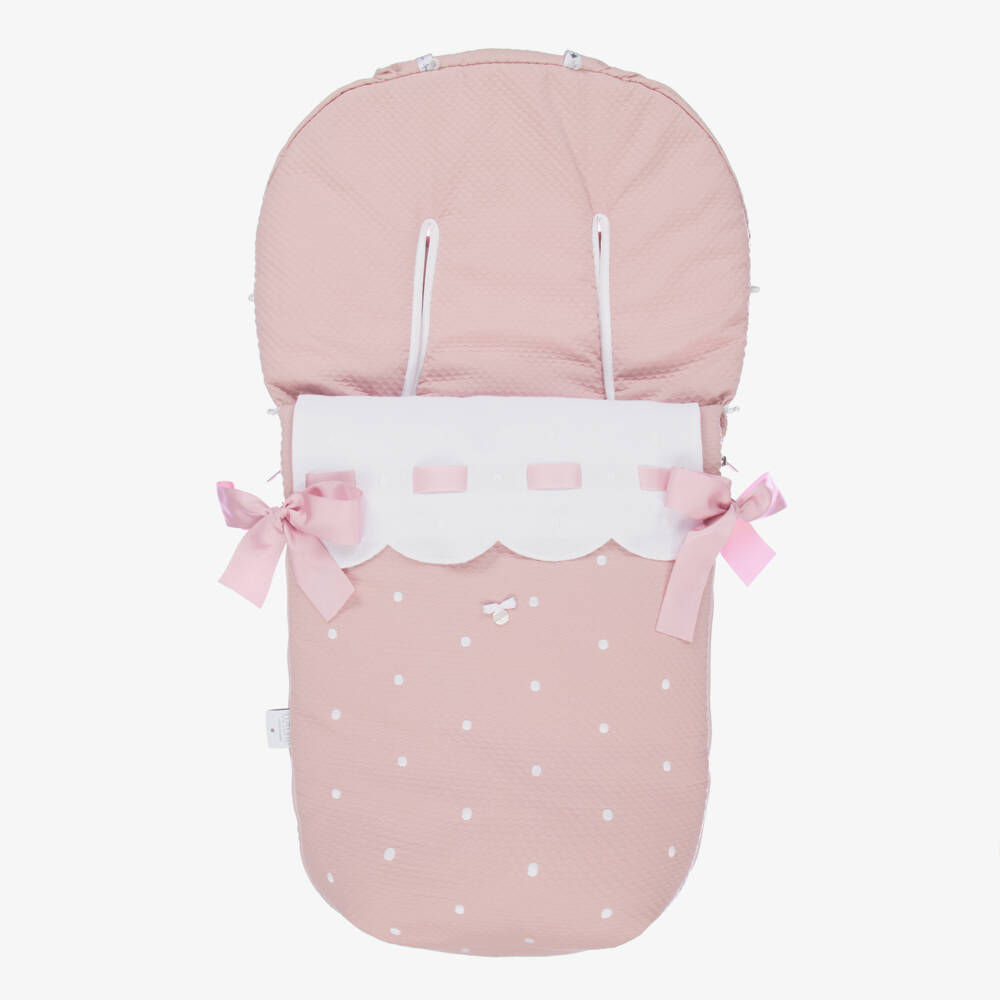 A softly padded pink footmuff for girls by Uzturre, for use in the stroller. Organic, lightweight and with a honeycomb pattern in the weave, it is embroidered with white dots. Across the front is a detachable scalloped white trim, embellished with pink ribbon and a logo charm with a bow below. It fastens on both sides with a zip and toggles, which are decorated with grey ribbons that tie in bows. The back sits over the stroller and has logo ribbons, with velcro openings and elastic velcro straps.
