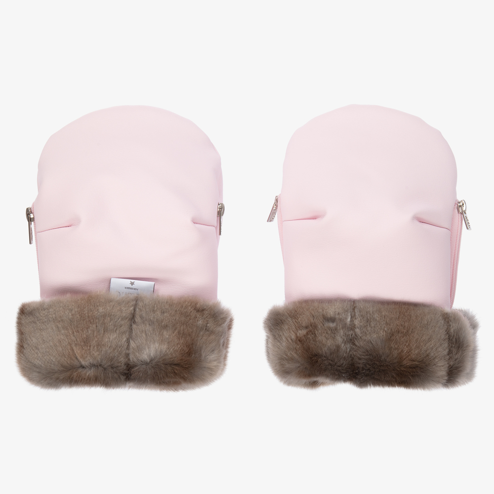 Pale pink stroller mittens by Uzturre, handmade with smooth faux leather. Ideal to keep parents' hands warm, these water-repellent mittens have a super soft plush fleece lining, lightweight padding and faux fur trims to protect against the wind and cold weather. Cosy and breathable, there are side zips to ensure a great fit.