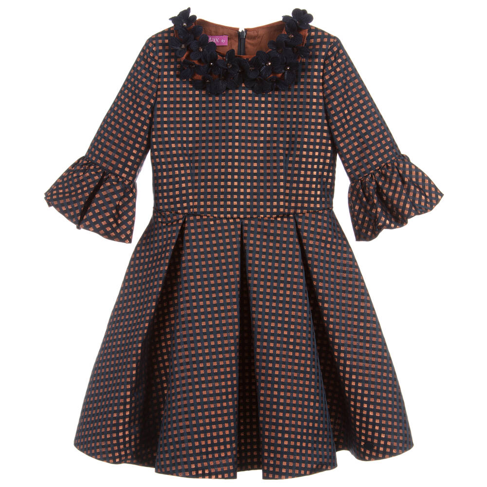 An elegantly smart dress by ValMax in a burned gold and navy blue check. The dress comes with a separate collar decorated with appliqué flowers and crystals which ties in a bow behind the neck. The dress is fully lined in silky viscose with a stiffened hem to add volume.