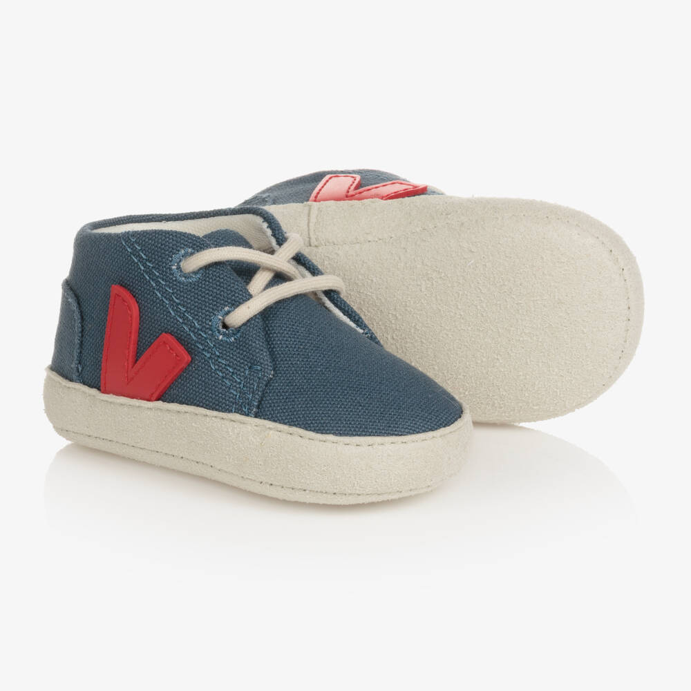 A cool pair of navy blue trainers for baby boys, by VEJA, with a signature 'V' logo in red. Comfortable and convenient for little feet, these flexible canvas shoes have a soft textile lining and fasten with laces. They are neatly finished with faux suede outsoles.