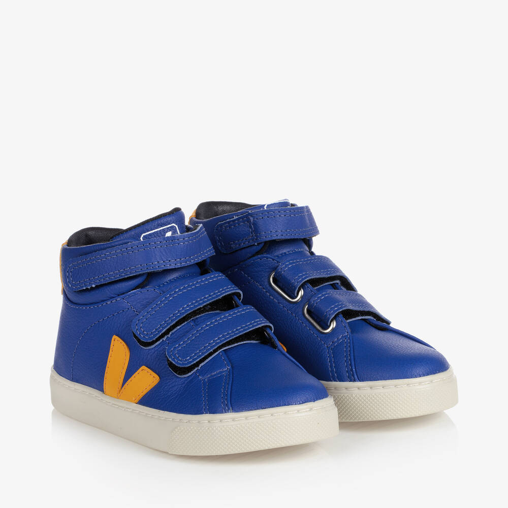 Bright blue high-top trainers for boys by VEJA, made in soft, chrome-free leather. Lined in a soft recycled textile, they have a comfortable cushioned organic cotton blend insole and useful velcro strap fastenings. In a cool high-top style, they have the signature 'V' logo on the sides with a matching orange logo trim on the back of the ankle. The chunky outer sole is made from Amazonian rubber and rice waste for a stylish, yet eco-conscious finish.
