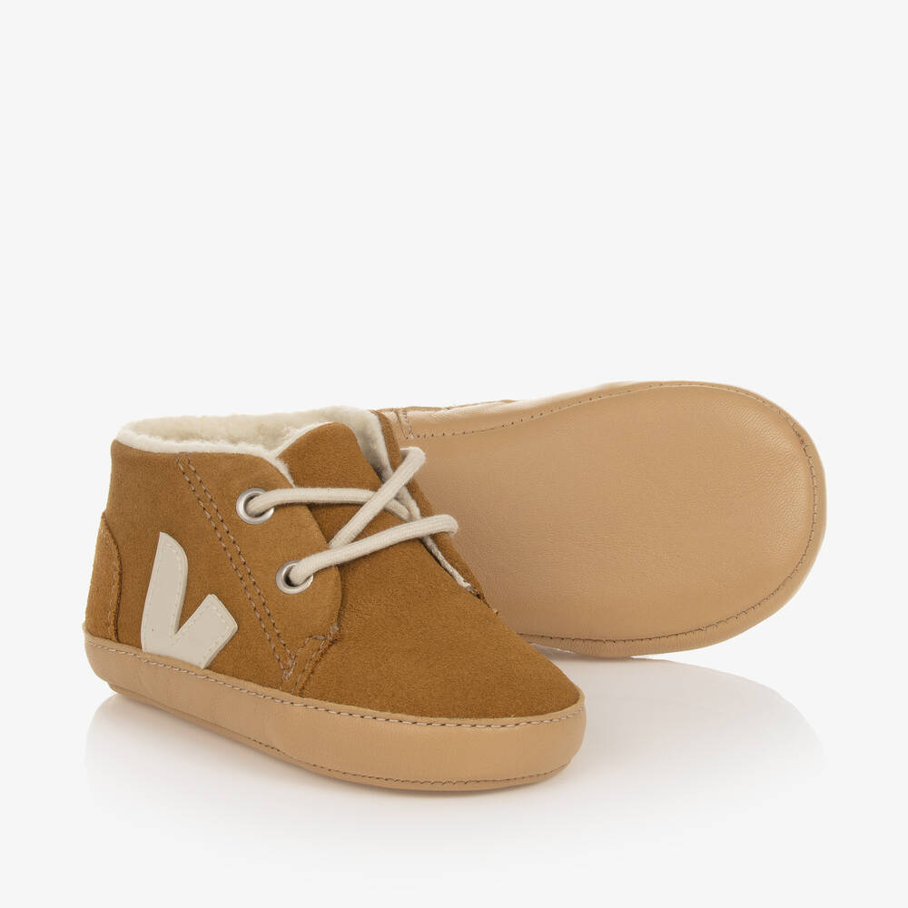 Tan brown pre-walkers for baby boys and girls from VEJA, fastening with laces for that classic look. Made from beautifully soft suede leather, without hazardous or prohibited chemicals, these cute shoes are signed with the French label's signature logo appliqué on the sides. With a flexible leather outer sole, they have a soft sherpa fleece lining and insole to keep little feet warm.