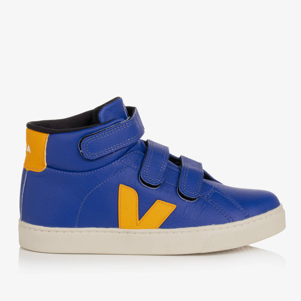 Bright blue high-top sneakers for teen boys by VEJA, made in soft, chrome-free leather. Lined in soft recycled textiles, they have a comfortable cushioned organic cotton blend insole and velcro strap fastenings. In a cool high-top style, they have the signature 'V' logo on the sides with a matching orange logo trim on the back of the ankle. The chunky outer sole is made from Amazonian rubber and rice waste for a stylish and eco-conscious finish.