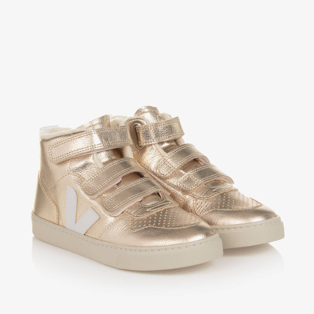 In a metallic rose gold effect, these leather trainers for teen girls are from VEJA. Stylish and eye-catching, they are appliquéd with the brand's signature white 'V' logo on each side, with perforated detailing on the front. They are designed in a high-top style with velcro fastenings and a warm sherpa fleece lining. A rubber outsole with grip complete the look.