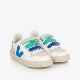 Ivory leather V-10 trainers for boys and girls by VEJA, with the signature V logos in vibrant lilac and further branding on the tongue and heel for instant designer appeal. There are coordinating lilac, blue and orange velcro strap fastenings and a perforated toe cap for breathability, along with a comfortable lining. The non-slip outer sole is made in wild rubber sourced from the Amazonian forest, reflecting the brand's commitment to sustainability.