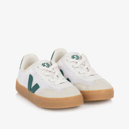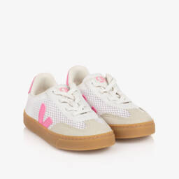White mesh trainers for girls by VEJA, with pink organic traced leather and beige suede trims. Inspired by the Brazilian volleyball shoes of the 70s, these sustainable trainers are very lightweight and breathable. They have the signature V logo on both sides and branding on the tongue and heel for instant designer appeal. Slip-on in style, they have fixed, elasticated laces and a non-slip rubber sole for good grip.