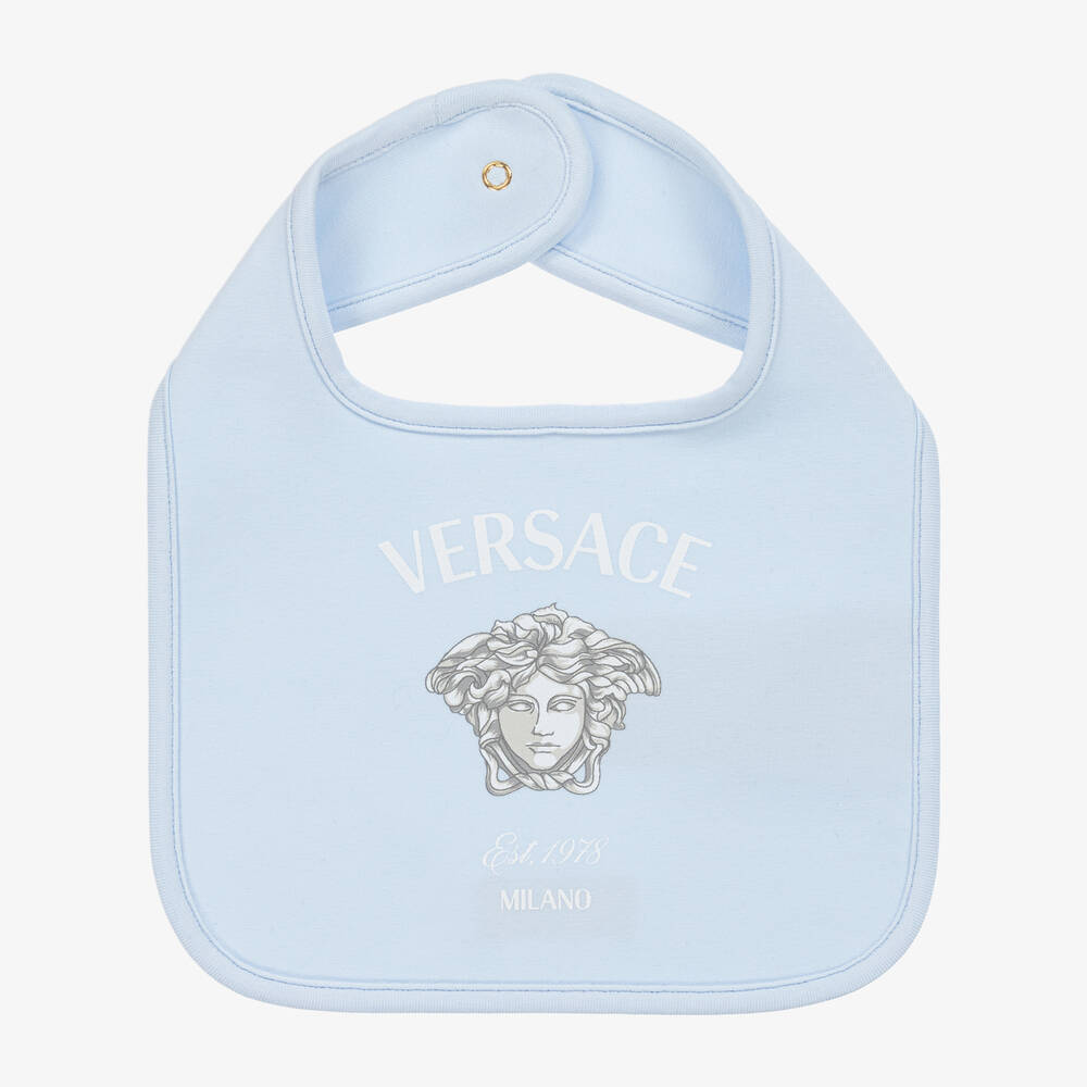 A pale blue bib for baby boys by luxury Italian brand Versace. Made from soft cotton jersey, it is printed with a light grey and white Medusa logo design on the front for a signature look. It fastens with a shiny gold Greca-embossed popper on the back for a distinct finish.