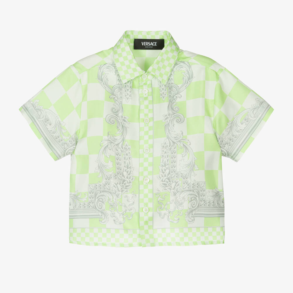 Mini-me green and white silk shirt for baby boys by luxury Italian brand Versace, made in lightweight and flowy twill. A modern take on the iconic Barocco design, this shirt is patterned in checkerboard with a signature Medusa logo on the back. It is finished with a pointed collar, short sleeves and a button-up front.