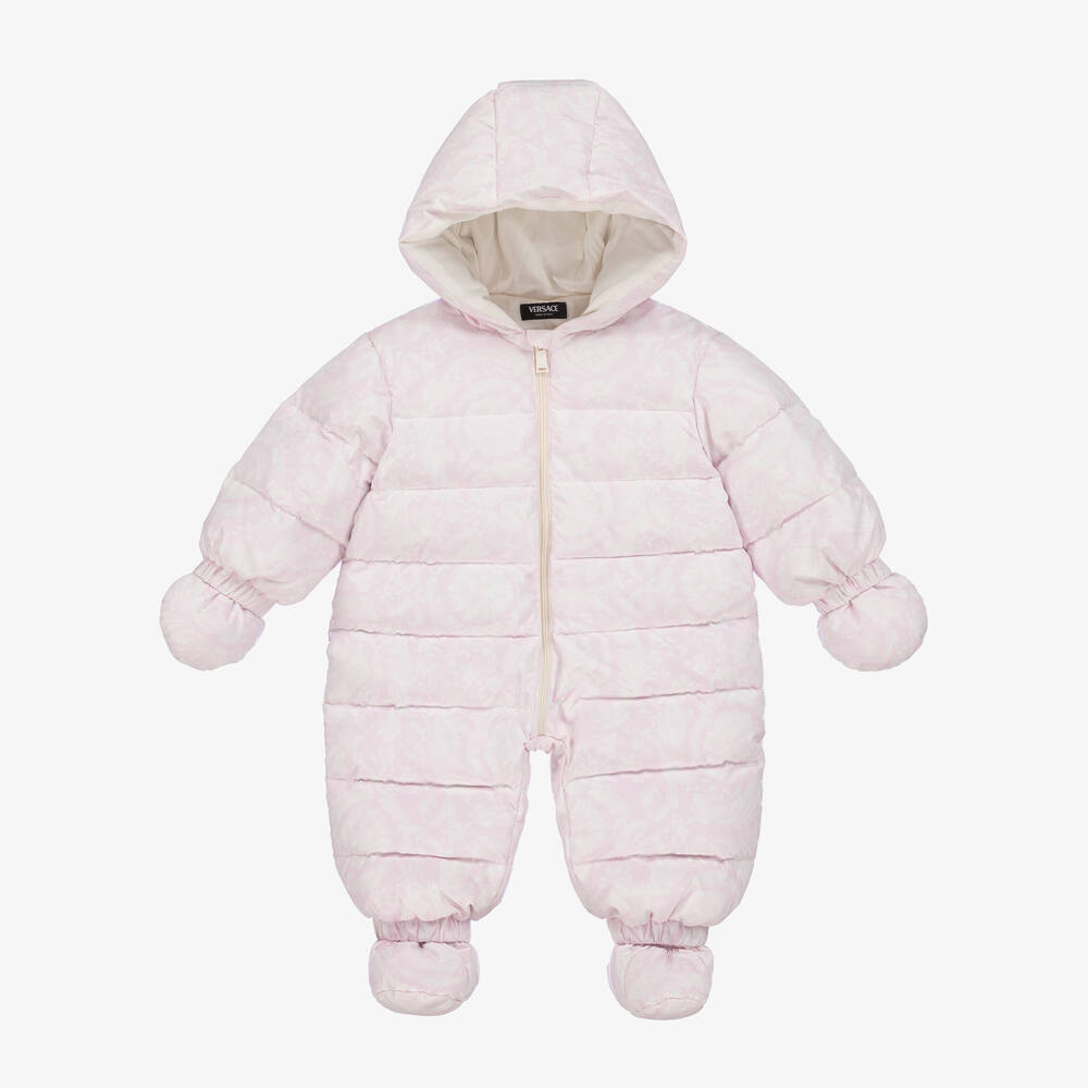 Pale pink and white puffer snowsuit for baby girls by luxury Italian brand Versace. It is patterned in the designer's iconic Barocco print for a distinctive look. Silky smooth and lined in comfortable cotton jersey, it has soft down padding for superior comfort and warmth. There is a front zip fastening and a fixed hood, with detachable mittens and booties which attach with buttons.