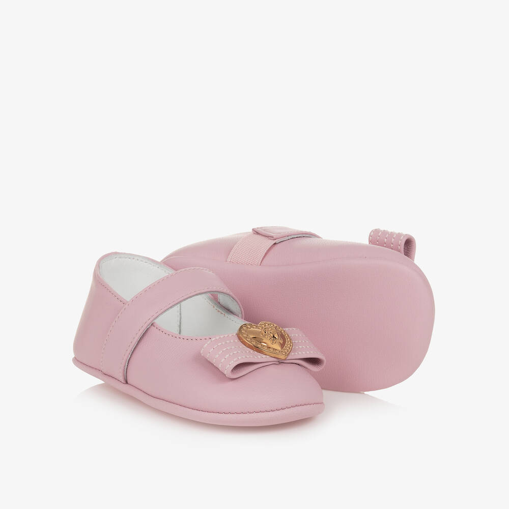 Adorable pale pink pre-walker shoes for baby girls by luxury brand Versace. Beautifully crafted in Italy, they are fully made from super soft and supple leather with a gently padded insole. The front is decorated with a sweet bow with over stitchings and a heart-shaped Medusa medallion in gold tone. Easy to slip on, they have a fixed strap with an elasticated panel on one side to keep little feet in place comfortably.
