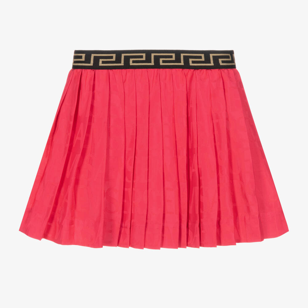 Stunning bright pink skirt for baby girls by luxury Italian brand Versace. This sweet skirt is crafted in beautifully soft pleated satin with a tonal logo pattern. Easy to wear, it simply pulls on and has a comfortable stretchy, elasticated waistband featuring the iconic La Greca pattern for a stylish finish.