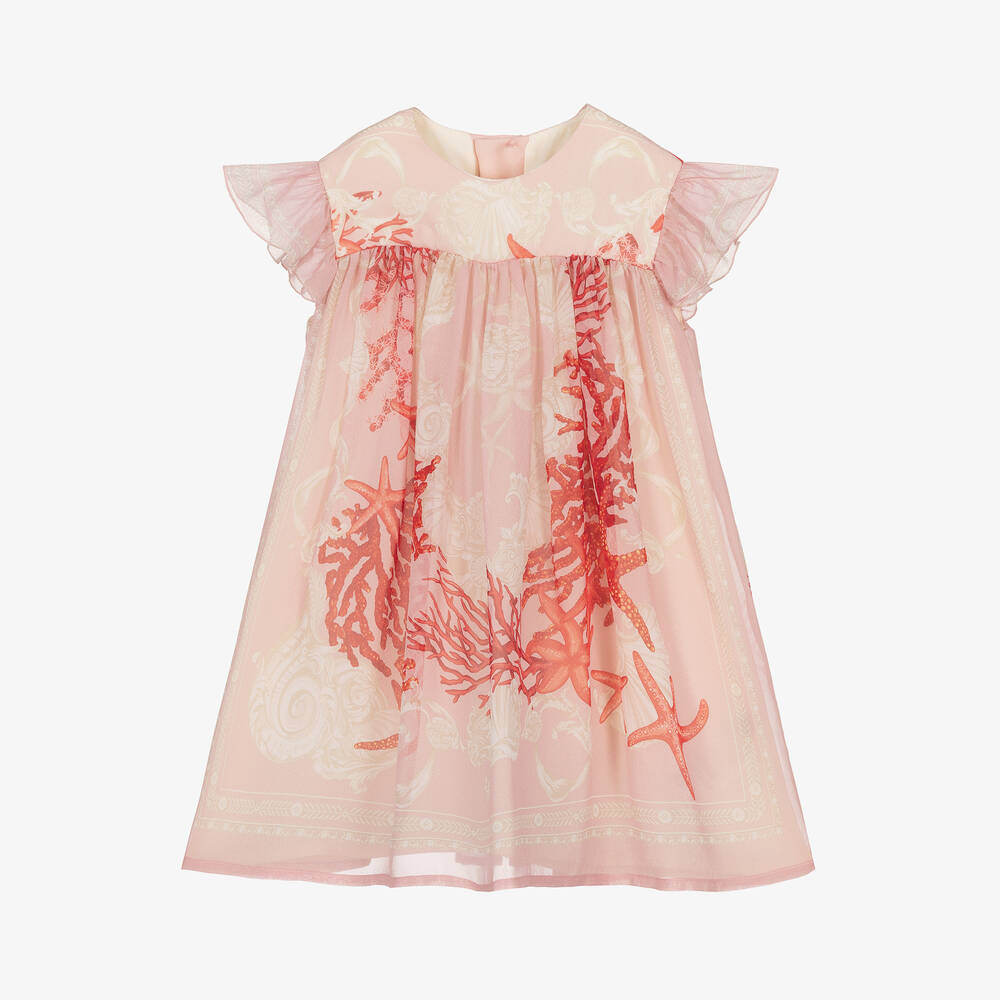 A beautiful pink dress for baby girls by luxury Italian brand Versace, inspired by the main collection. It is printed with the distinctive Barocco Sea pattern, featuring striking red coral, starfish and subtle beige ornate shells. Made from a lightweight silk georgette with a soft silk-blended crêpe chiffon lining, it has sheer, ruffled short sleeves and fastens neatly with ivory branded buttons on the back.