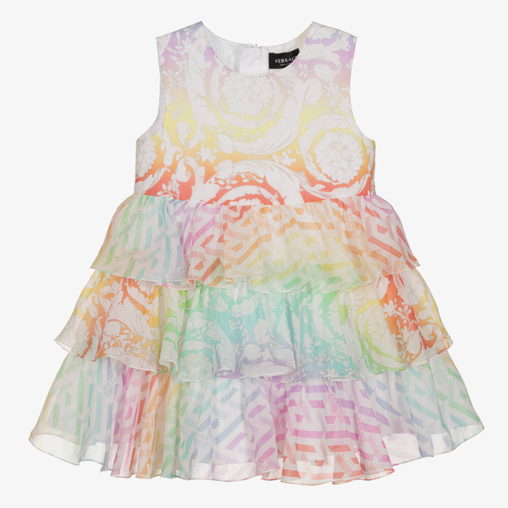 In an array of rainbow colours, this adorable tiered dress for baby girls is by Italian designer Versace. Made in luxuriously soft and sheer silk chiffon, it incorporates the brand's iconic Barocco and La Greca prints into this beautiful sleeveless dress. Fully lined in soft cotton voile for ultimate comfort, the invisible zip fastening on the back gives it a seamless look. A pair of cotton poplin bloomers in matching La Greca print completes the look.
