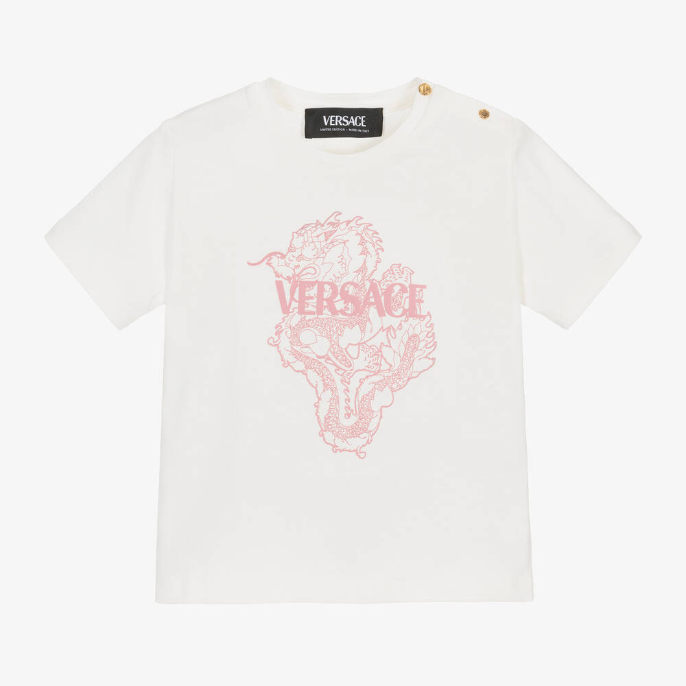 An off-white T-shirt for baby boys and girls by luxury Italian brand Versace, made in beautifully soft cotton jersey. In celebration of the Lunar New Year, this comfortable short-sleeved tee has a dragon and logo design on the front in pink. Gold-tone branded popper fastenings on one shoulder help with dressing.