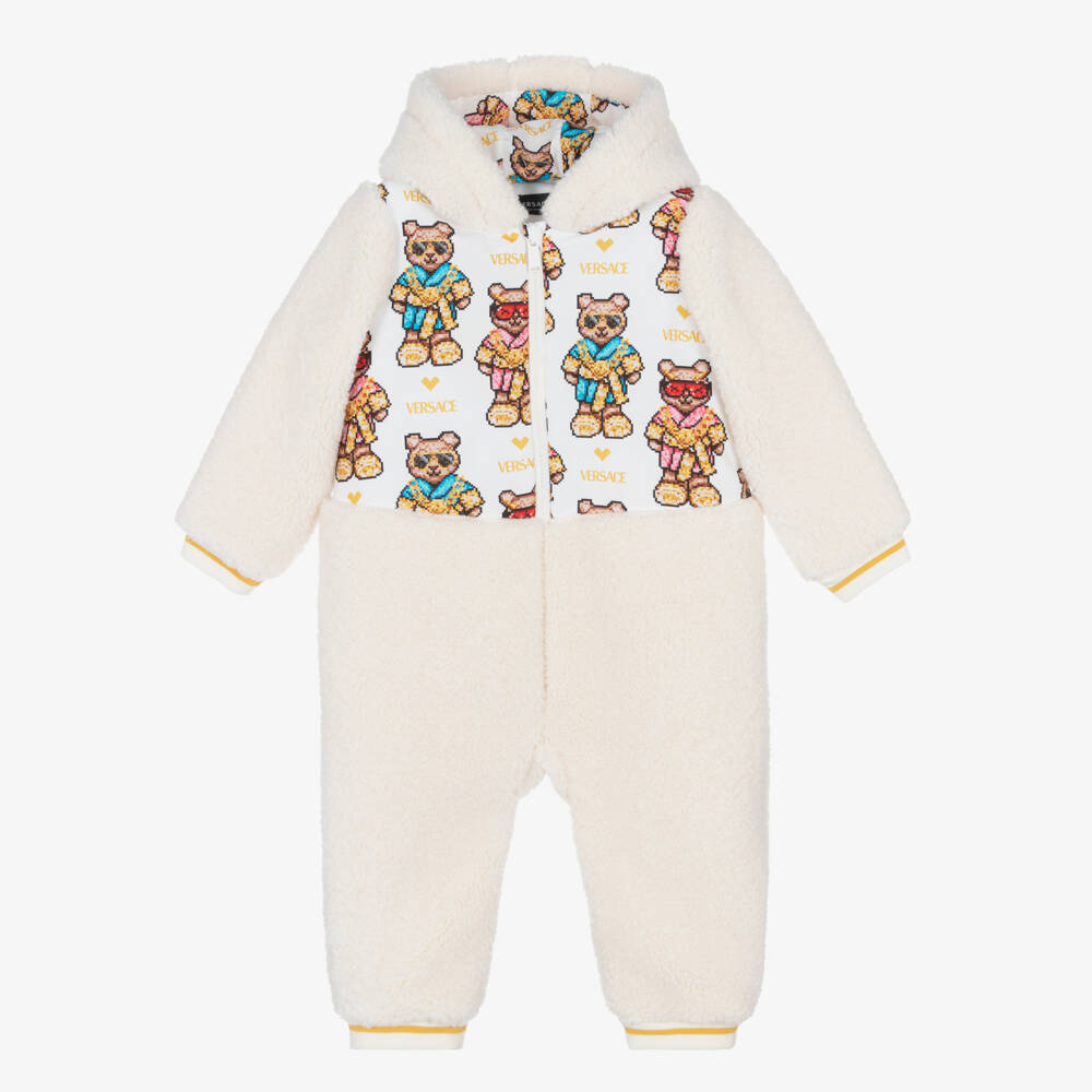 Cosy and warm, this beige fleece pramsuit for baby boys and girls is by luxury Italian designer Versace. Unmistakably by the brand, the silky ivory bodice and hood lining are patterned with colourful, pixelated teddy bears, hearts and logos. The front zip fastening has a useful, protective chin guard, and there are ribbed, yellow-striped trims for extra cosiness.