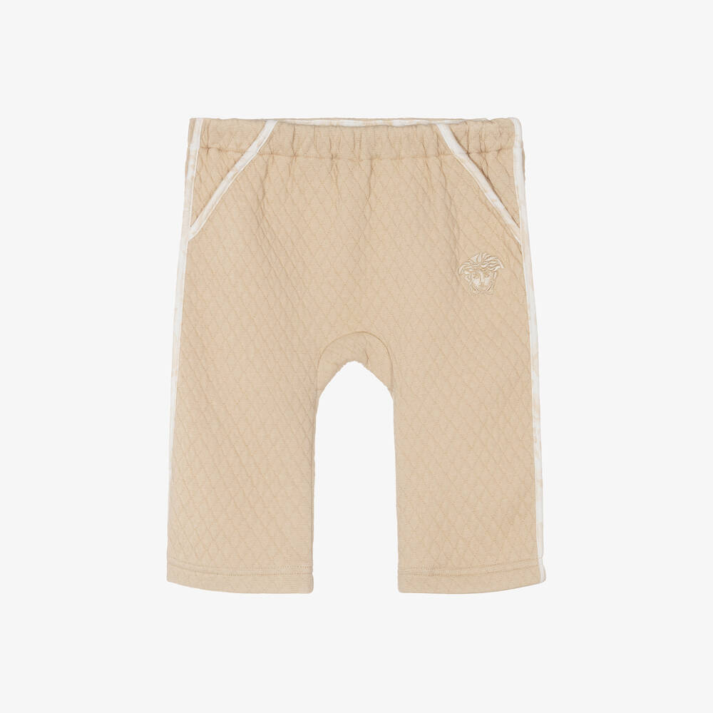 Beige cotton-blend trousers for baby boys and girls by luxury Italian designer Versace, with the label's signature Medusa logo embroidered on one side. Endlessly comfortable, they are made in soft, quilted jersey, with a stretchy, elasticated waistband and are easy to wear, simply pulling up. Ivory trims with the brand's beige Barocco print add a stylish touch.