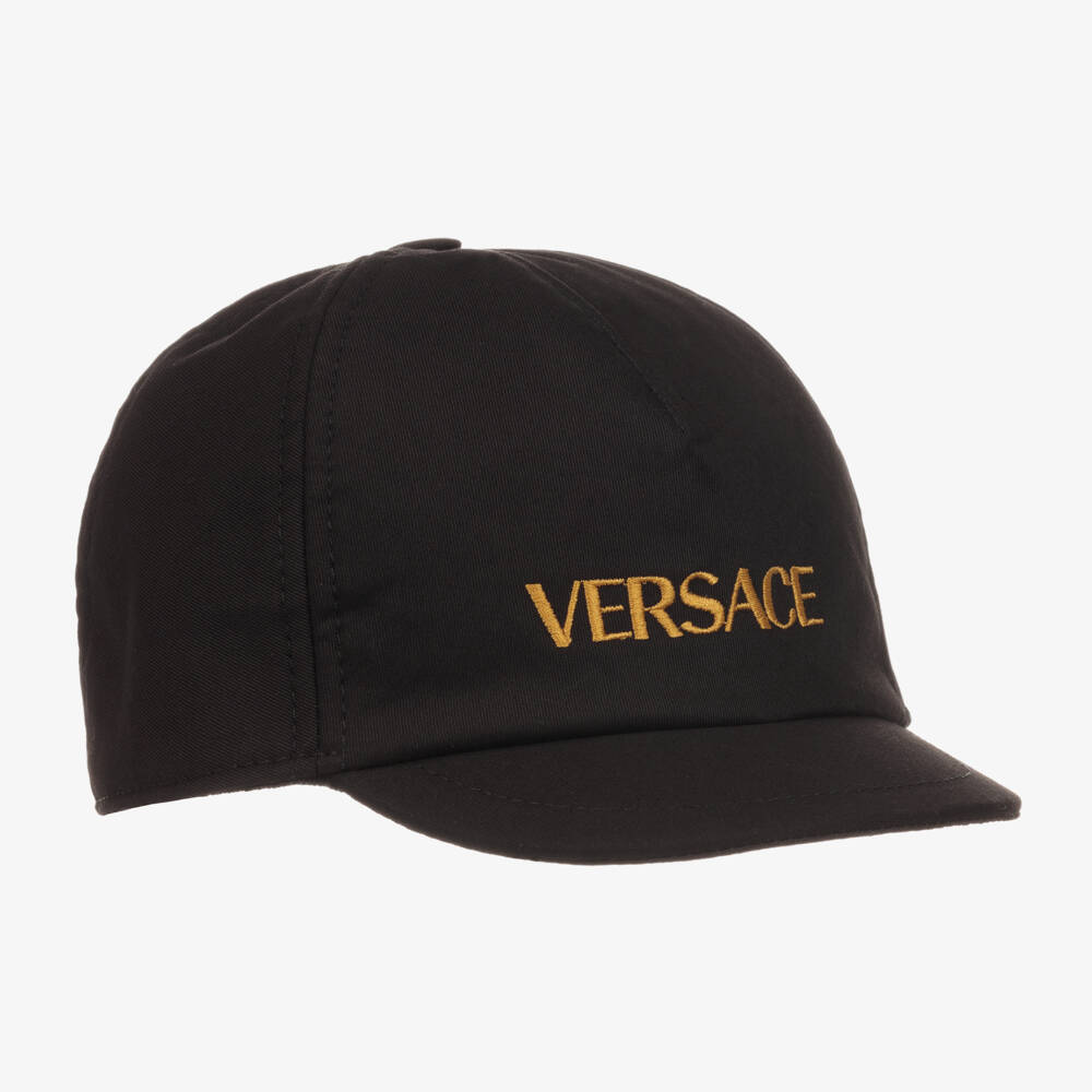 Black twill cap for boys and girls by luxury Italian brand Versace, with an embroidered gold logo on the front. Lined in cotton for added comfort, the back is elasticated for a good fit.