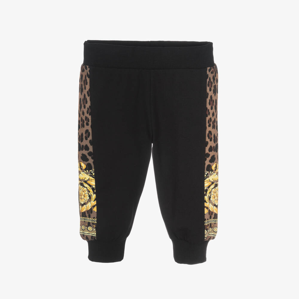 Inspired by the adult collection, these black joggers for younger boys and girls by luxury Italian label Versace, are made in soft, mid-weight cotton jersey. A casual piece with a striking designer touch, these comfortable joggers have the brand's ornate Wild Barocco print in gold and brown trimming the sides of both legs. Tonal logo embroidery on the back patch pocket adds an extra branded touch and the lightly ribbed ankle cuffs and gently elasticated waistband ensure comfort.