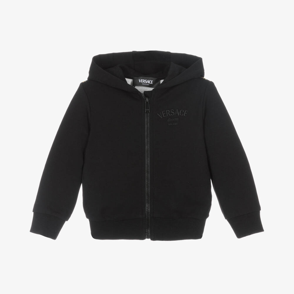 Inspired by the adult collection, this black zip-up hooded top for younger boys and girls by luxury Italian label Versace, is made in soft and comfortable cotton jersey. Making an instant designer statement, the back of the top features the brand's Wild Barocco print in gold and brown, whilst the front has tonal logo embroidery for a more discreet touch. There are useful pockets concealed in the side seams and a branded zip fastening on the front, with a chin guard at the top to protect delicate skin.