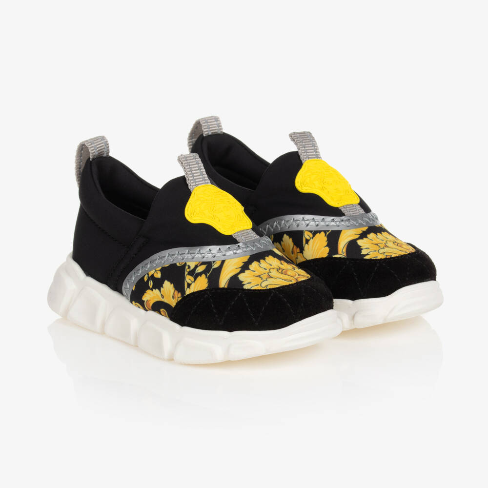 An exquisite pair of black trainers for little boys and girls, by luxury Italian brand Versace. These on-trend shoes are defined by the signature Medusa logo, with the opulent Baroque print below. Made in a smooth and stretchy textile upper with suede detailing, these shoes have tabs for an easy, pull-on design. The leather insole and chunky non-slip outer sole ensure comfort while maintaining style.