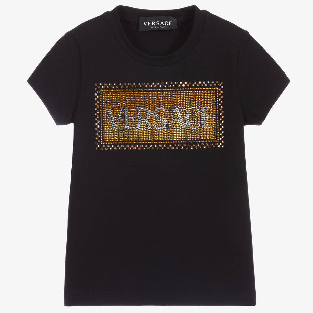 Girls black cotton jersey T-shirt, by Italian luxury brand Versace. It has a gold and silver stud and sparkly diamanté logo on the front.