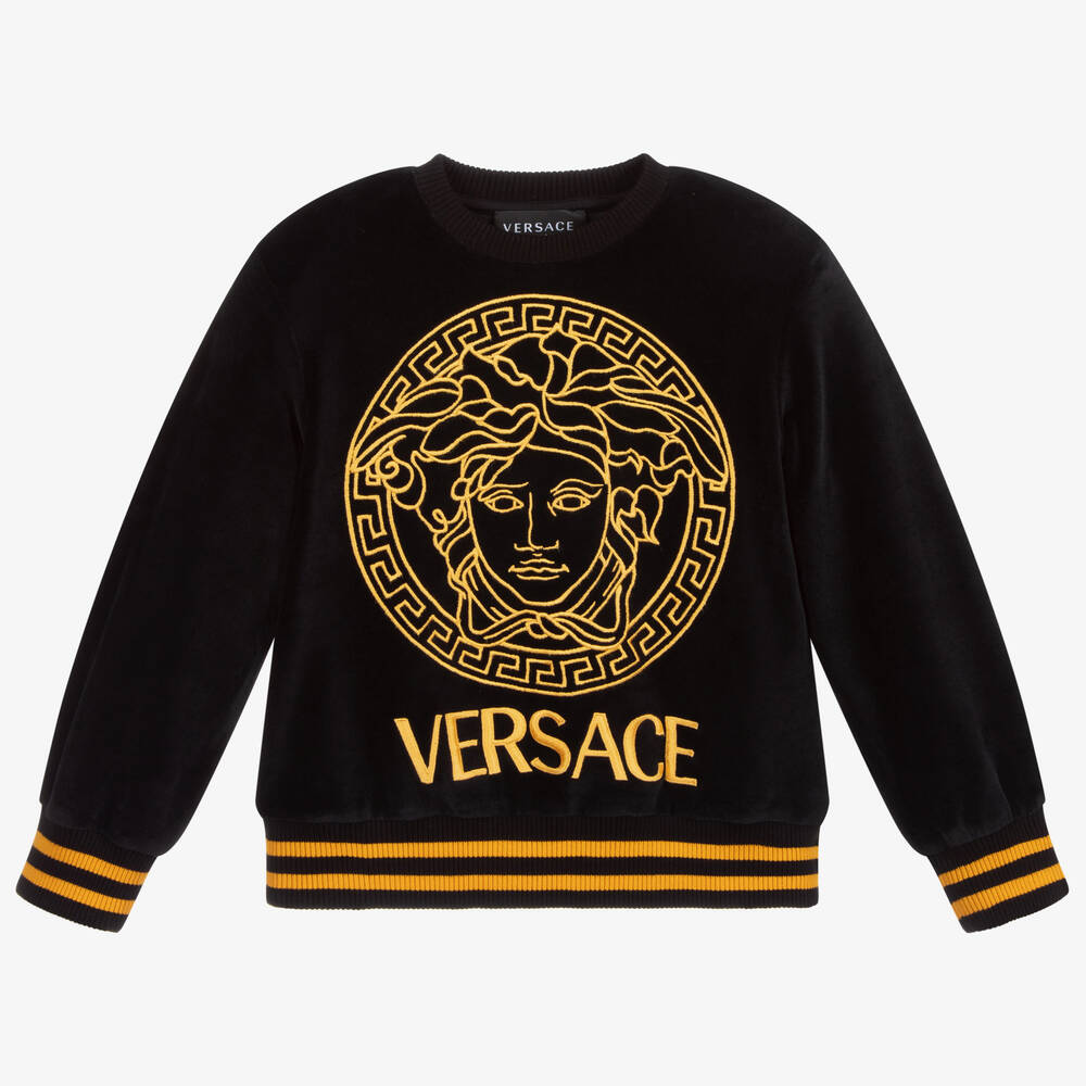 Black sweatshirt for girls by luxury Italian brand Versace, made in soft cotton velour. It has a gold embroidered Medusa logo on the front with gold striped trims on the ribbed cuffs and hem.