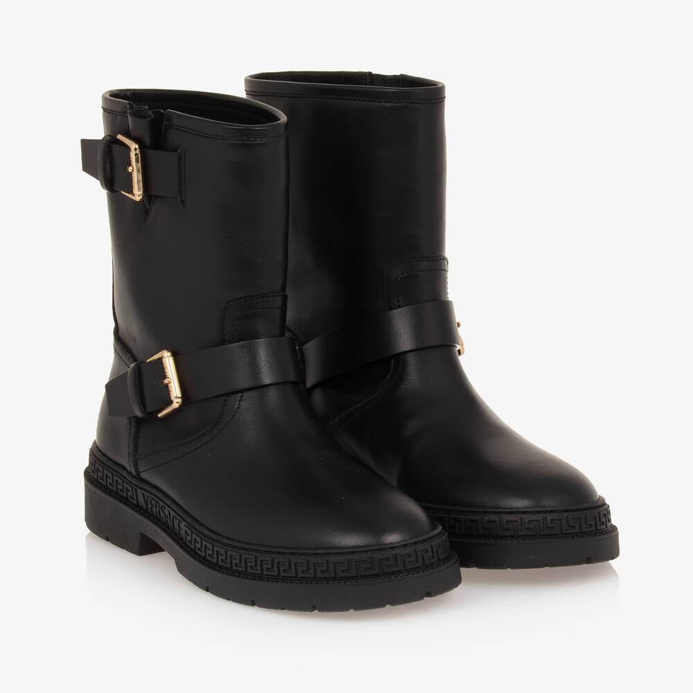 A cool and edgy style from Italian designer Versace, these black leather biker boots for boys and girls are trimmed with gold-hued, branded buckles. Medusa, the luxury brand's icon, is featured on the back and embossed Greca trims the midsole for that unmistakable designer look. The lining and insoles are leather for luxurious comfort and the non-slip outsoles are treaded with the House's well-known codes. The upper buckle can be unfastened to help slip the shoes on.