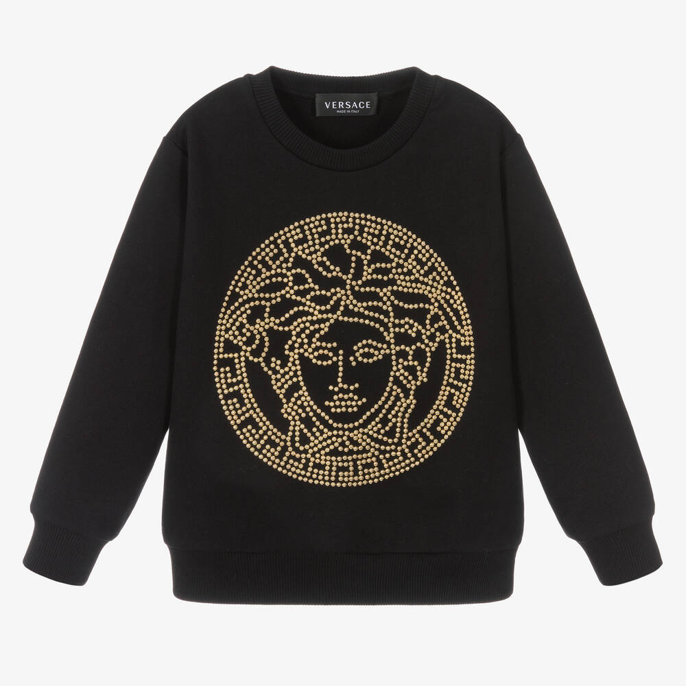Elevated black sweatshirt for boys and girls by luxury Italian brand Versace, made in soft cotton jersey with a looped underside. The gold studded Medusa logo adds opulence to this classic design.