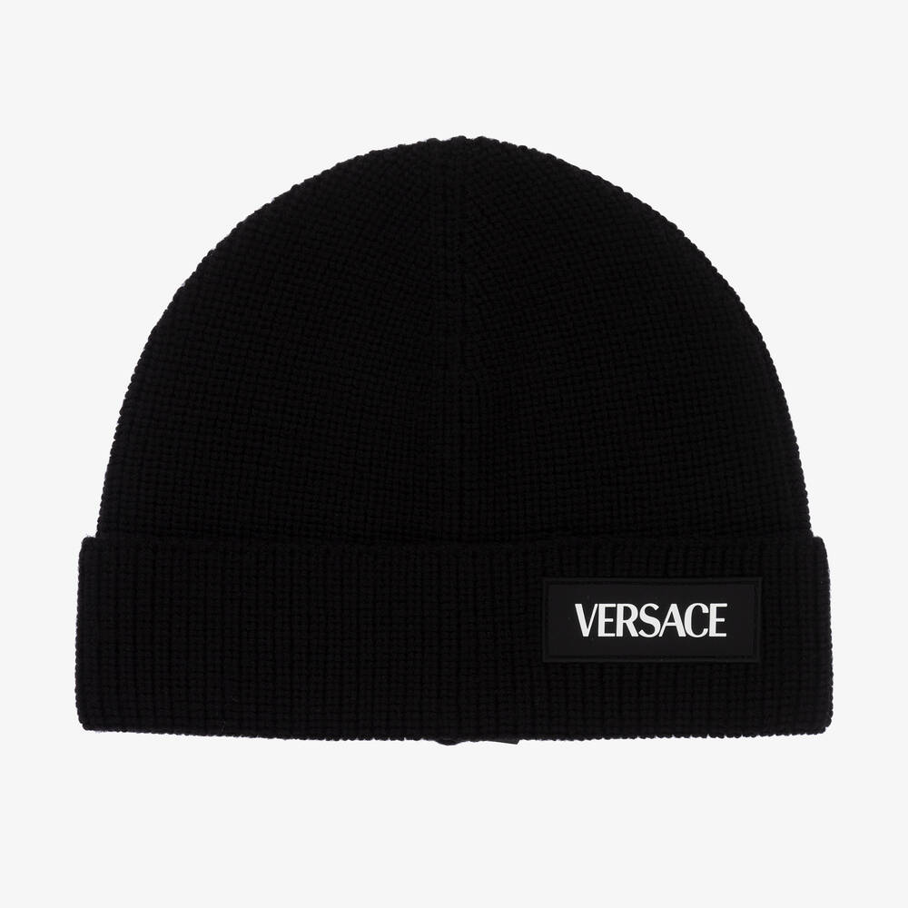 A black wool beanie hat for boys and girls by luxury Italian fashion house Versace. Softly knitted, this stylish hat has a warm fold-over hem with the designer's bold white rubberised logo on the front.
