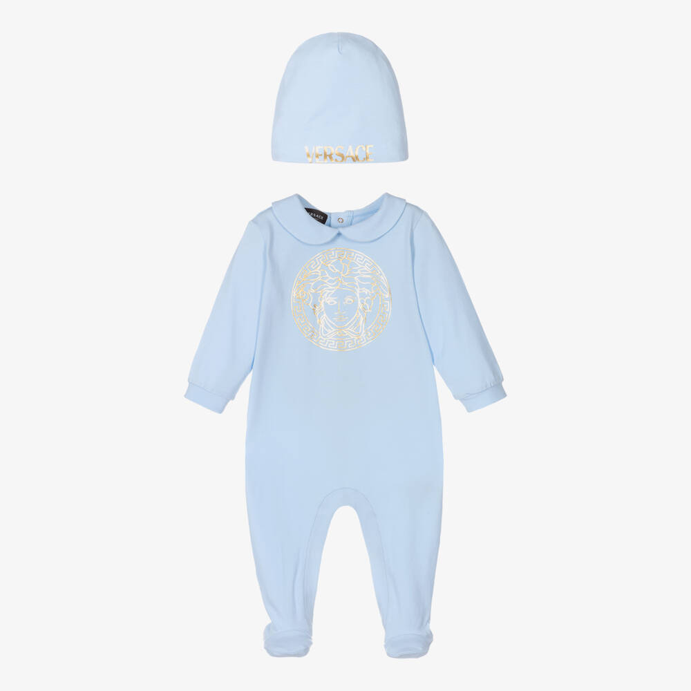 Pale blue cotton jersey babygrow for boys by Italian luxury brand, Versace. It has an eye-catching gold foil print of the brand's iconic Medusa on the front and a rounded collar for a classic look. It fastens with logo embossed gold popper fastenings on the back and between the legs. It comes with a matching double layer hat, which is printed with the brand's logo to complete the look.
