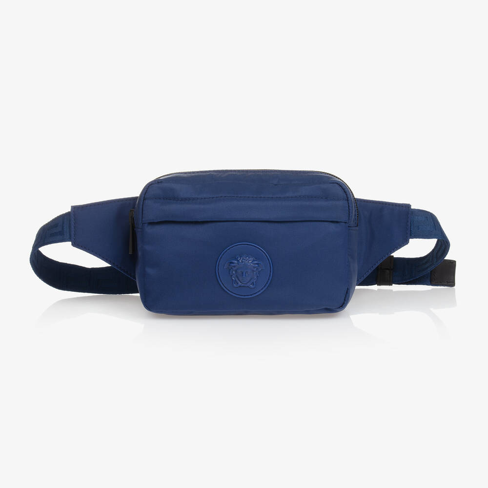 Deep blue belt bag for boys and girls by luxury fashion house Versace, made in soft, smooth fabric with leather accents. Completing his or her outfit effortlessly, this stylish bag has a strap enhanced by jacquard Greca branding and an embossed Medusa motif on the front. Just right for small essentials, it has a main compartment and a hidden front pocket, both fastening with branded zips and lined with cotton and viscose. The adjustable strap secures easily with a clip buckle.