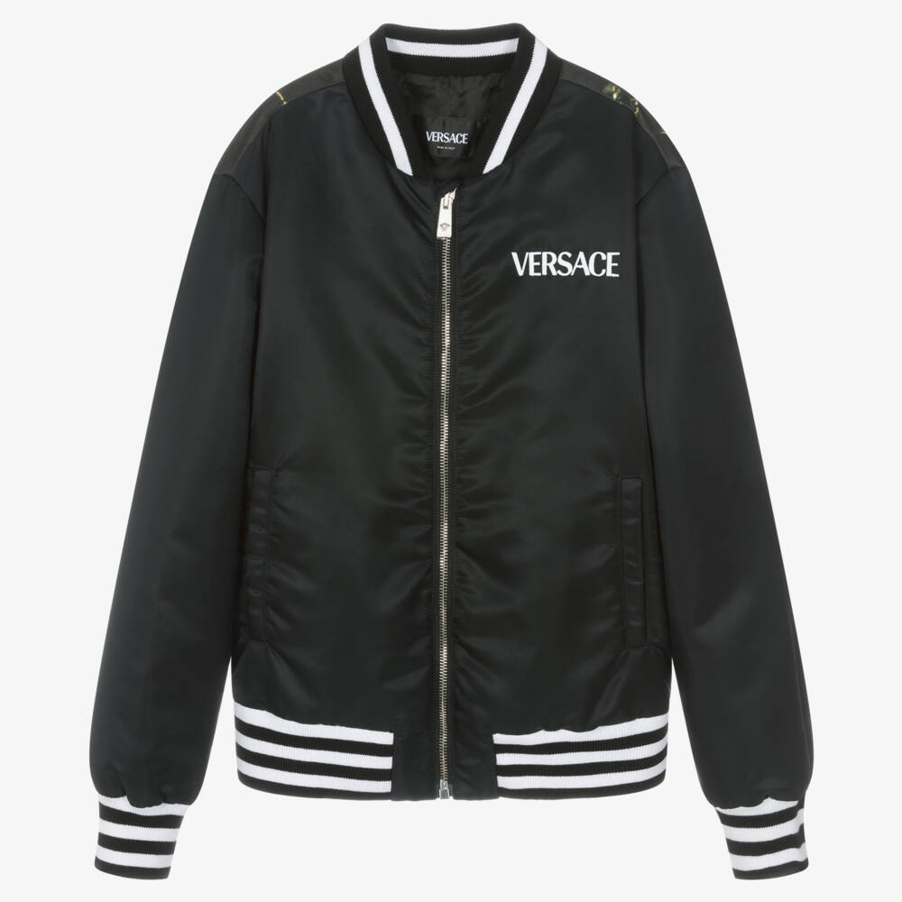 Mini-me black bomber jacket for older boys by luxury brand Versace, made from silky smooth, lightly padded fabric. Varsity-inspired, it has a bold white logo embroidered on the front and coordinating striped ribbed trims. The exposed zip fastening has a three-dimensional Medusa motif on the zip pull and the front pockets are comfortably lined. Making an instant designer statement, the graphic print on the back captures a snapshot of the city at night with vibrant lights and a distinctive logo print across the shoulders.