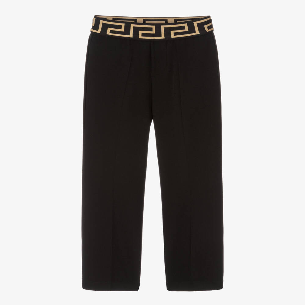 Ideal for smarter occasions, these black trousers for boys by Italian luxury brand Versace are made in a soft, mid-weight viscose blend jersey. These stylish trousers have pockets on the front and faux welt back pockets. For a distinctive designer look, they have a comfortable black and gold Greca patterned elasticated waistband.