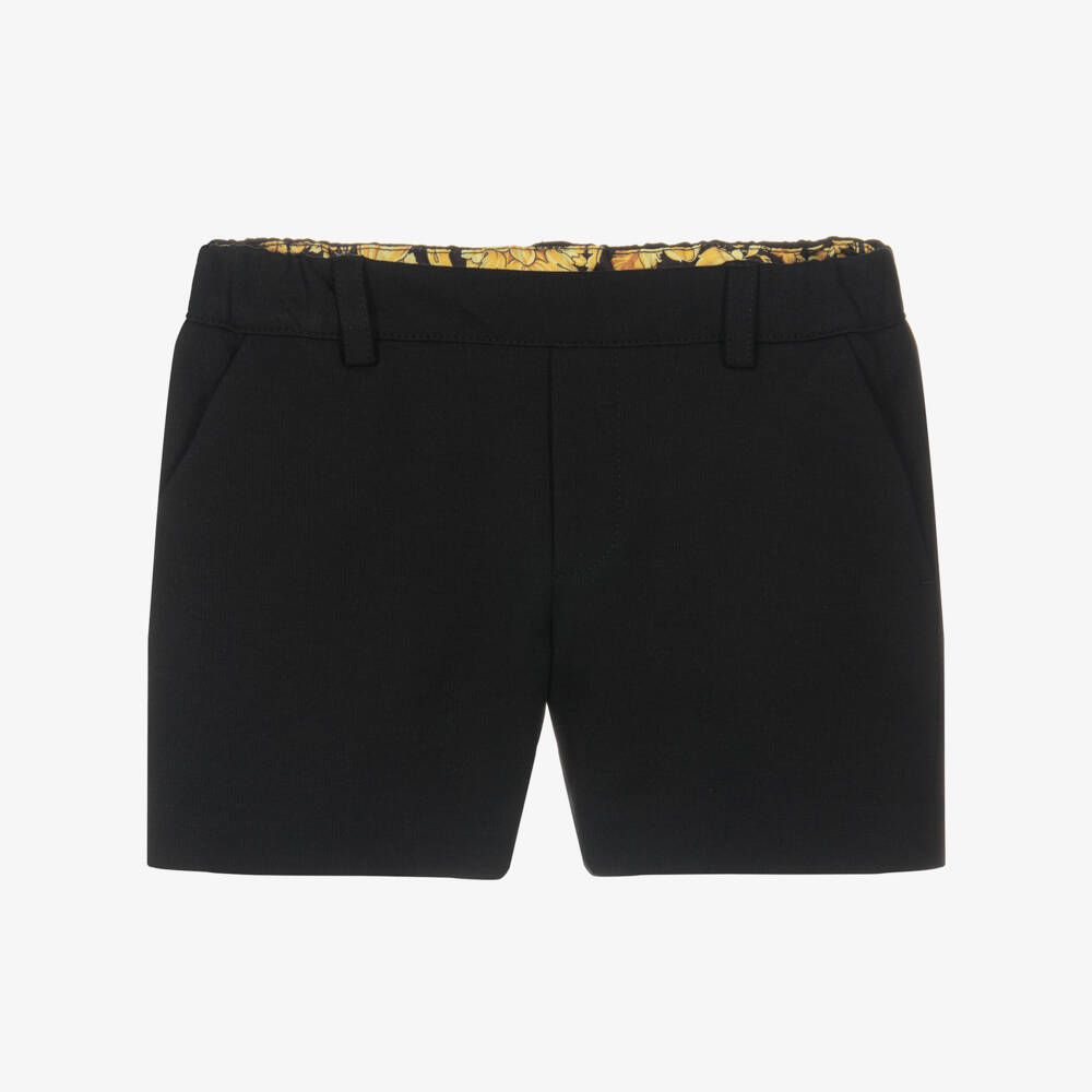 Smart black Milano jersey shorts for little boys by luxury Italian designer, Versace. The elasticated waistband has belt loops on the outside and the brand's signature Barocco print in gold on the inside. Made in a soft viscose blend, there are slanted pockets on the front and a faux pocket around the back.