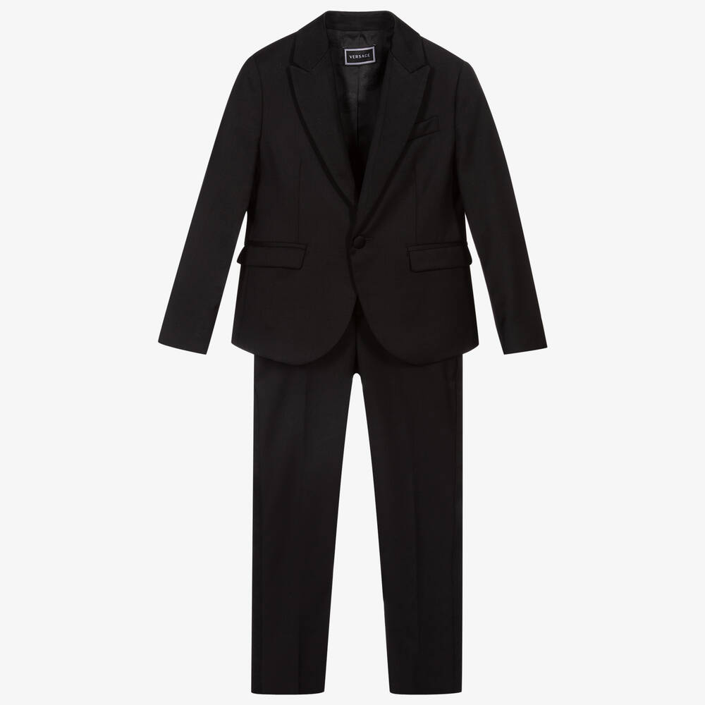 Boys black tuxedo suit by Versace, made from luxurious soft virgin wool, with classic silky trims. Lightweight, the jacket has a logo patterned satin lining, back vent and three pockets on the front. The matching trousers have silky trim, useful pockets and an adjustable waistband for a comfortable fit.