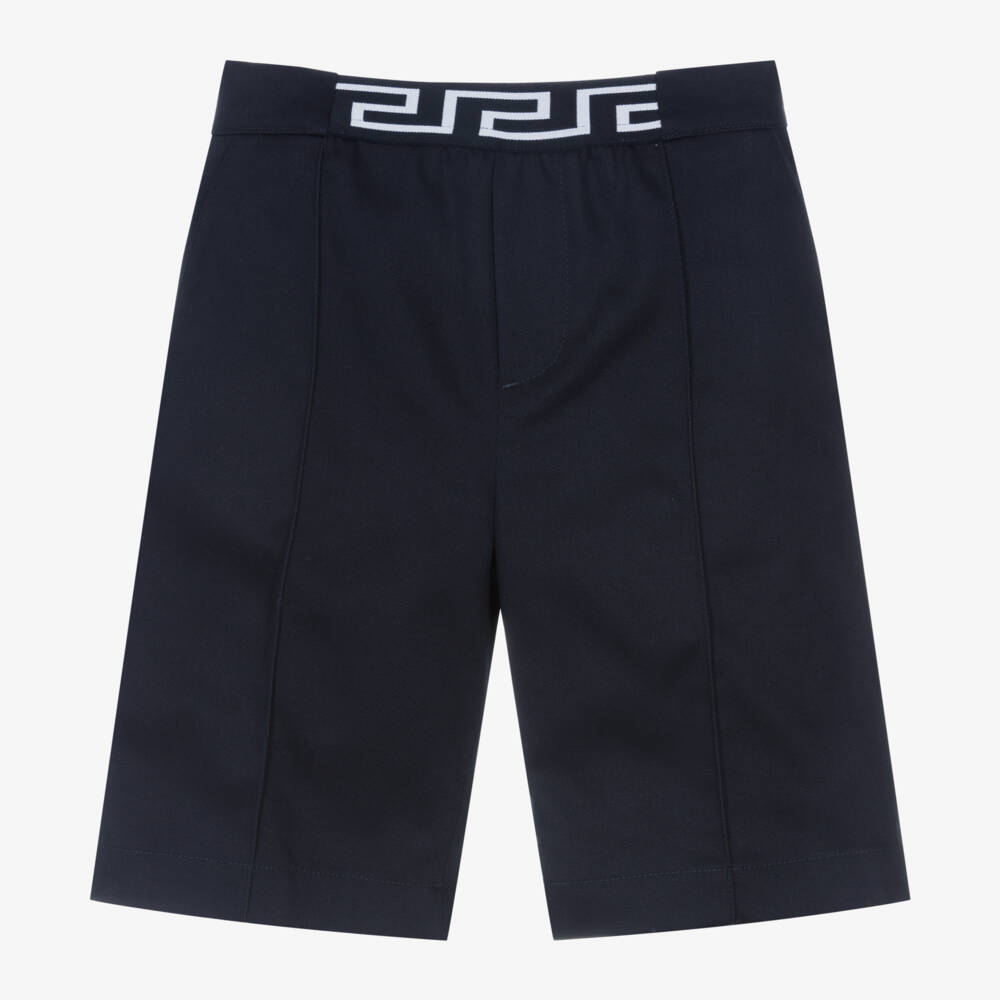Stylish navy blue cotton shorts for boys by luxury Italian designer Versace. Unmistakably by the brand, there is an elasticated Greca panel on the front of the waistband. There are smart centre seams and useful slanted pockets on the front. Around the back, the waistband has belt loops and is elasticated for a good fit. Easy to wear, they simply pull up.