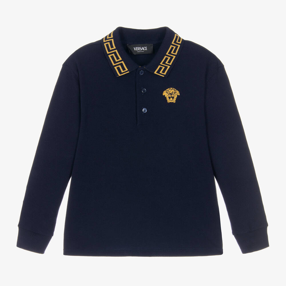 Smart-casual navy blue polo shirt for boys by Italian luxury designer Versace. It has the brand's conic Medusa embroidered in gold on the chest, with signature Greca detailing around the ribbed collar. Made in soft cotton piqué, the shirt has long sleeves and a branded button placket.